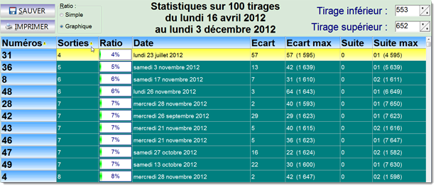 figuré par le petit triangle dans le libellé de la colonne triée en cours) C'est très pratique par exemple pour mettre en relief de façon rapide quels sont les numéros les plus sortis lors des 100 derniers tirages (colonne Sorties). Exemple : Pour les 100 derniers jours, le numéro le plus sorti est le 31. |