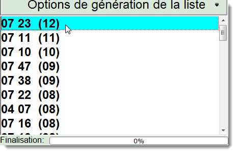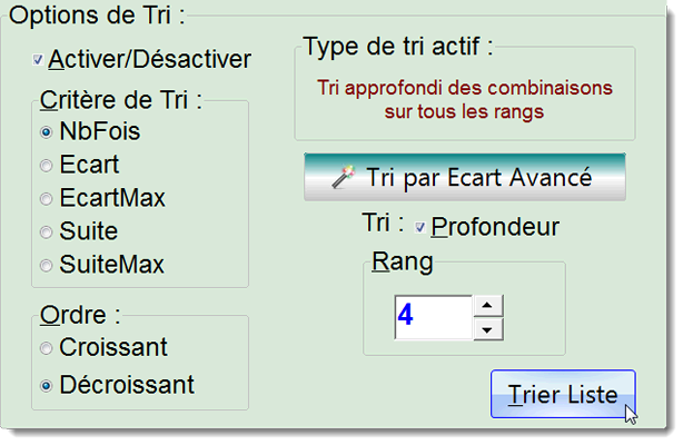 | Je viens de calculer les combinaisons à 5 numéros jamais sorties appartenant à ma martingale, quelle est celle qui a le plus de fois obtenu 4 numéros sur 5 ? | Vous devez activer les options de tri et remplir avec le bouton RANGS tous les rangs de chaque combinaison afin de permettre le tri en profondeur. Une fois ce calcul effectué, vous n'avez plus qu'à cocher l'option tri en profondeur puis choisir le rang 4 dans la zone d'édition prévue à cet effet. Il vous reste à choisir le critère Nbfois pour le tri et l'ordre décroissant et enfin cliquer sur le bouton Trier Liste pour obtenir en tête de liste la combinaison demandée. | |||||||